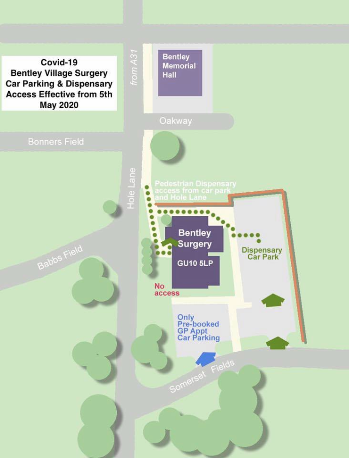 The Bentley Village Surgery dispensary will continue to operate but access is now signposted. This will maintain complete physical separation of services and avoid any contact between patients needing treatment and people collecting prescriptions.