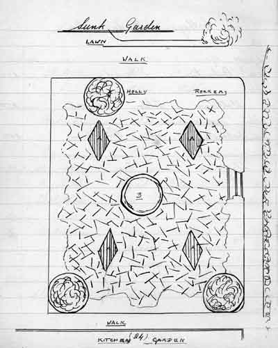 Froyle Place, photographed in 1912. Although somewhat fuzzy (one day we might find a sharper photo!) you can still see the sunken garden in front of the main part of the house and a closer look also shows the fountain in the middle of the garden. However, we do have a copy of the plan that Mr.F.Horn drew up in his notebook for that area of the grounds. |