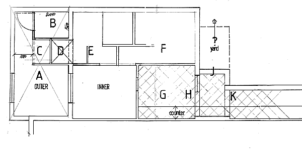 of the plan (Mouse-over the plan for details):- A. The new outer entrance hall - Inner hall is the existing entrance hall. B. New Disabled Toilet. C. Re-located Gents urinals. D. Modesty panel in Gents. E. Ladies toilets (unchanged). F. Existing Kitchen area. G. Wall removed to join kitchen and bar area (H) with Extension linking Kitchen and Bar. (This phase has now been completed - see below) |